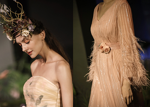 欧柏兰奴秀场新品不仅仅是时尚和潮流,更是一种设计态度,是用新的角度去探寻新视野下的审美哲学。汲取2019流行色中莫兰迪高级色系,营造柔美浪漫的艺术风格,运用印花,蕾丝、丝缎等精致面料,钉珠镶嵌、羽翼刺绣、立体花朵等工艺,展现现代女性臻美优雅的完美蜕变。