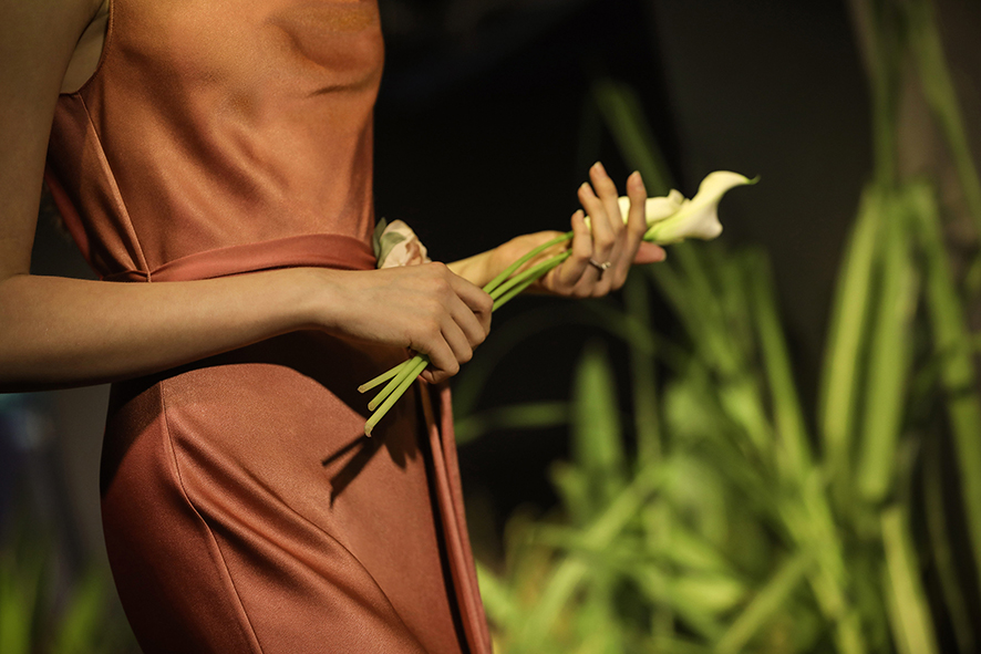 整个秀场以花之秘境的景象为灵感,碧水溪涧的灌木丛林呈现在视野中,葱郁青翠的绿植、野趣静谧的苔藓、恣意绽放的花朵,蜿蜒通幽的曲径,淡烟疏影,闲情自清。